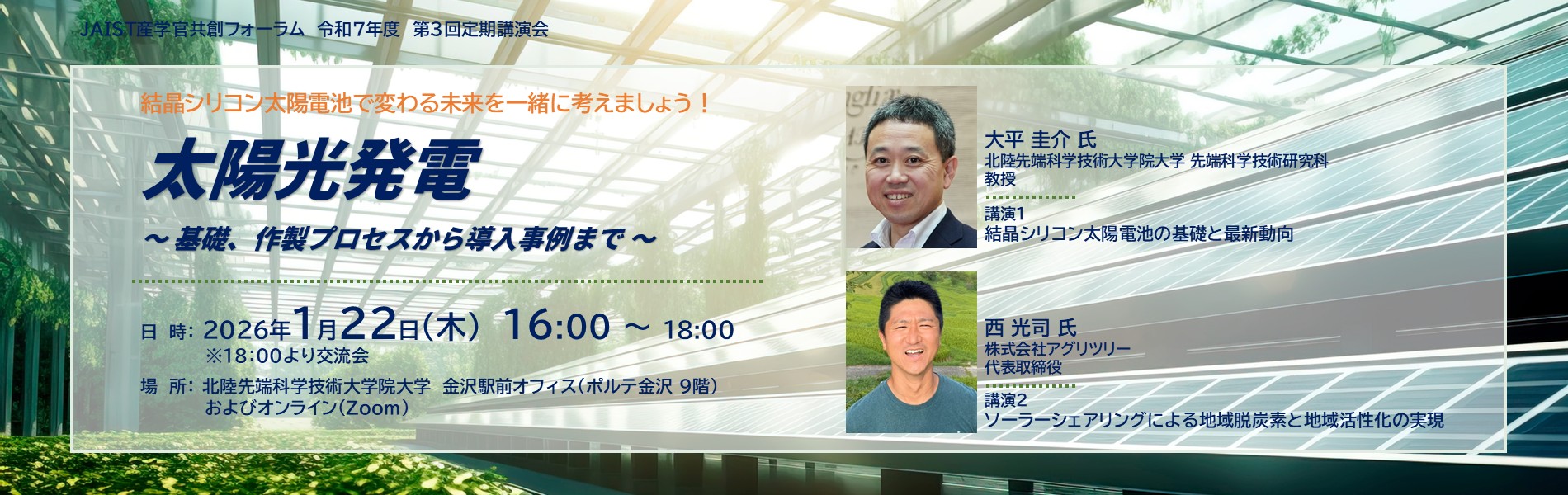 2025年12月12日 / 最終更新日時 : 2025年12月16日 JAIST-SO Web master お知らせ JAIST産学官共創フォーラム・令和7年度 第3回定期講演会 JAIST産学官共創フォーラムでは、その時々の旬なテーマをもとに先端科学技術情報をお届けする定期講演会を行っています。 令和7年度3回目の定期講演会は、 太陽光発電 〜 基礎、作製プロセスから導入事例まで 〜 をテーマに […]