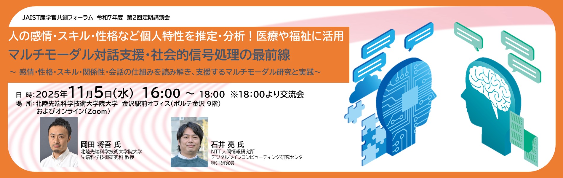 をテーマに、北陸先端科学技術大学院大学 教授 岡田 将吾 氏とNTT人間情報研究所 特別研究員 石井 亮 氏にご講演いただきます。