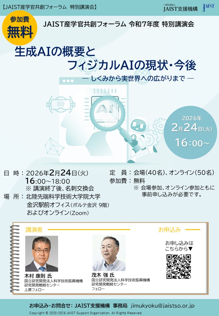 JAIST産学官共創フォーラム会員のみなさまに限らず、一般のみなさまもご参加いただけます(会場・オンライン参加:無料)。